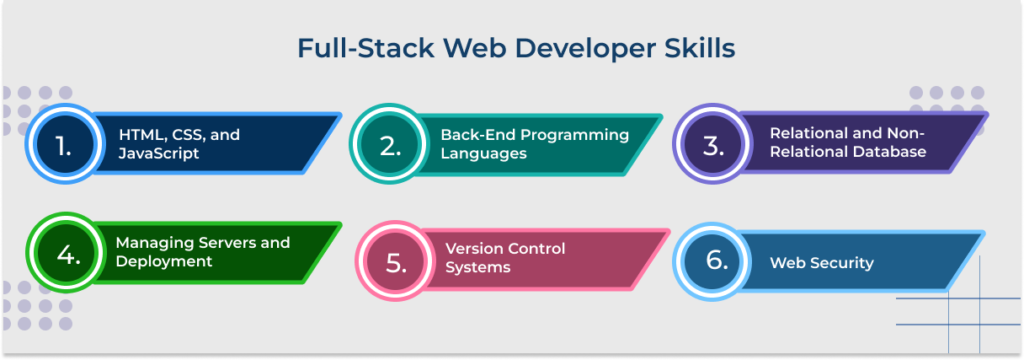 As digital transformation technologies change the face of industries around the world, full stack web developers are in high demand. Moreover, they deal with both front-end and back-end development of a web application, making them a crucial part of the development cycle. The year 2023 and onwards requires proficiency in programming languages such as HTML, CSS, JavaScript, front-end technologies, back-end technologies, database management systems, API development, version control systems, and cloud computing. Moreover, familiarity with security principles, problem-solving skills, and responsive design plays a key role in delivering high-performance web applications in the current and emerging digital technology landscape. Also, it is important that full stack developers keep upgrading their technical knowledge and learn new technologies to keep themselves at the edge in delivering efficient applications. Continuously upgrading these full stack developer skills ensures long-term relevance and adaptability in the tech industry.